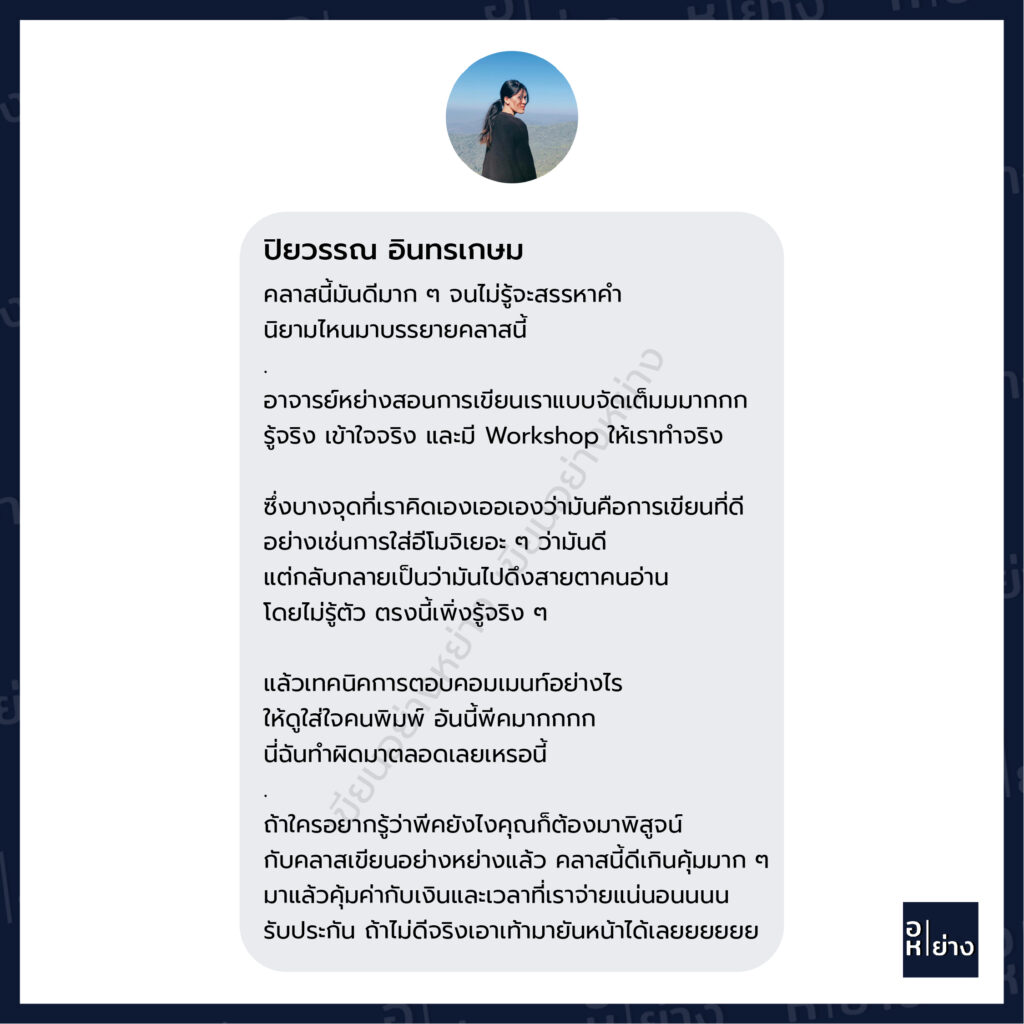 เพราะเนื้อหาในคลาสนี้ ล้วนเป็นจุดเริ่มต้นของงานเขียนที่ทรงพลัง ที่สร้างผลลัพธ์ให้ผม และมูลค่าของคลาสออนไลน์นี้อยู่ที่ 2,490.- โดยที่คุณสามารถกลับมาทบทวน ดูซ้ำกี่รอบก็ได้ และปัจจุบันมีนักเรียนในคลาสนี้มากกว่า 1,000 คนแล้วครับ