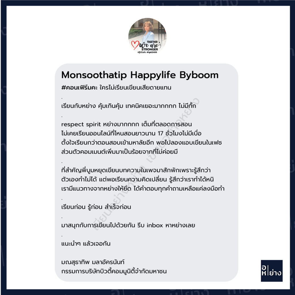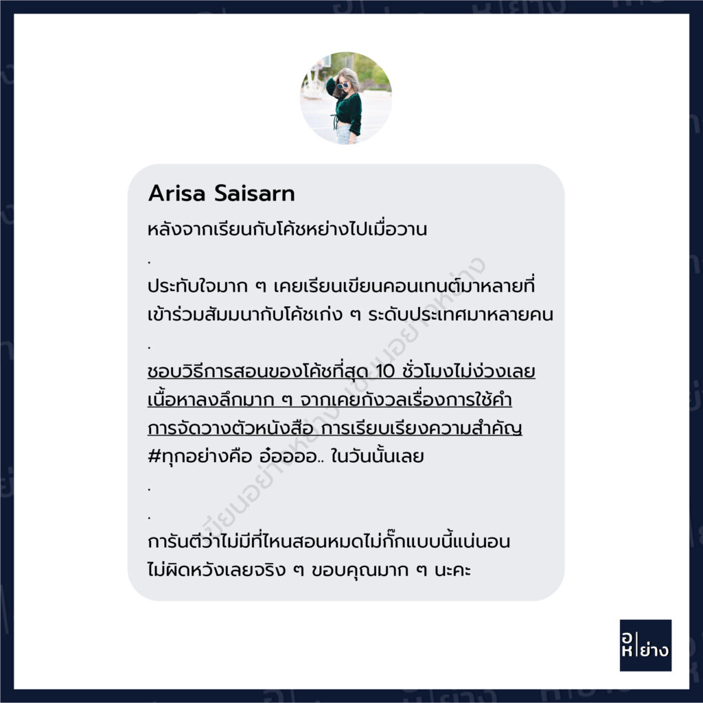แน่นอนครับ ส่งการบ้าน การเขียนคอนเทนต์ เข้ามาไว้ในกลุ่ม แล้วผมจะเข้ามาดู และ Feedback ให้ครับ และจะมีการ Feedback ที่เข้มข้น แบบ Live สด อ่านบรรทัดต่อบรรทัด Feedback ให้ด้วยครับ